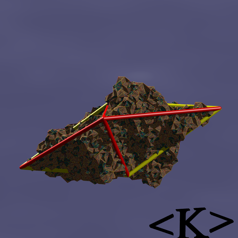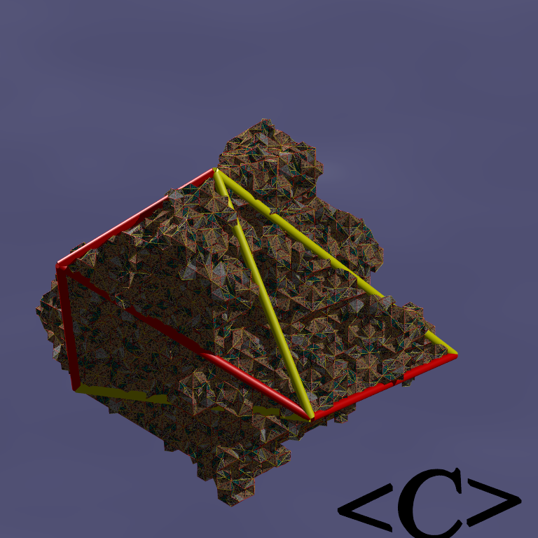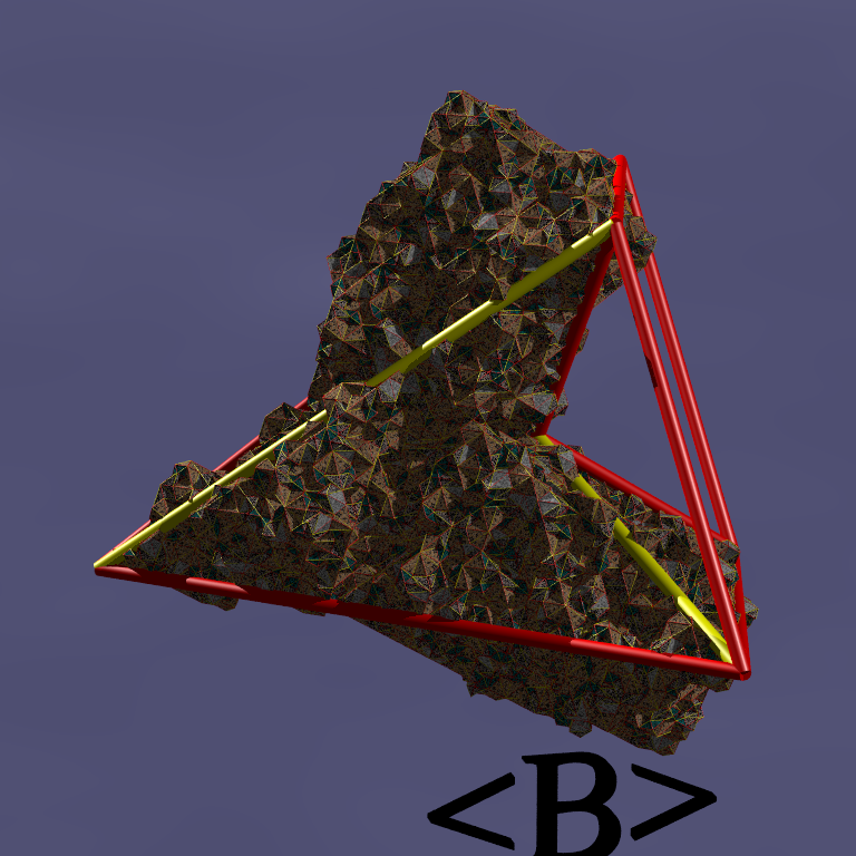 These images correspond to a level-7 fractal version of the 4 Danzer octahedra obtained by just 7 deflation levels of each tile (left) and by directly computing the fractal triangular facets of the tile (right).